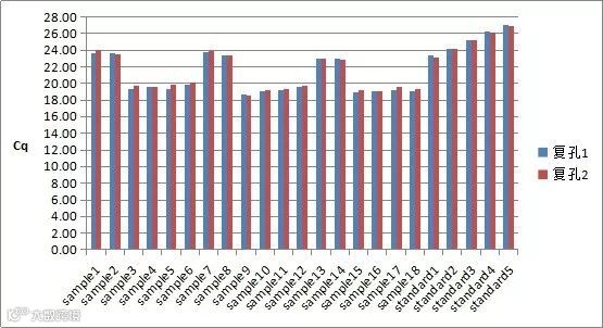 经测试,使用OneDip技术,完成23个样本, 每个样本2个复孔,扩增5个基因的qPCR体系构建,一共加样到230个孔,只用了28根枪头,不到35分钟就完成。Rob重复分配低体积的液体精确度和准确度都非常高,尤其适合qPCR体系构建时样本的添加。使用rob的OneDip重复分液技术,经过PCR实验证实,复孔之间Cq非常接近,重复性非常高。见下图。
