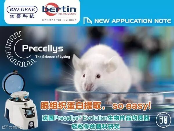 法国Bertin公司的Precellys® Evolution生物样品均质器,配合96孔板形式的裂解试剂盒,能够在不到2分钟的时间内,高效的研磨和均质各种眼组织,比如视网膜和眼杯,从而更快速更容易得到视网膜和眼杯裂解物。96孔板的裂解试剂盒适合于样本数量多,但是体积小的样本的蛋白提取,不需要预先研磨便可获得重复性高的蛋白提取效率。