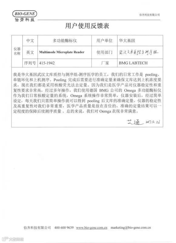 因为我们是医学产品,对仪器稳定性和重复性要求非常高,经过多年操作,我们使用德国BMG公司的Omega多功能酶标仪作为我们日常核酸定量的系统,Omega系统操作非常简单,仪器安装后,经过简单设定,每天我们只需简单操作就可以得到pooling后文库的准确定量。仪器的稳定性及高重复性对我们非常重要,医学产品质量是放在首位的,准确的定量结果可以一定程度的保障后续测序质量。总的来说,我们对Omega表现非常满意。