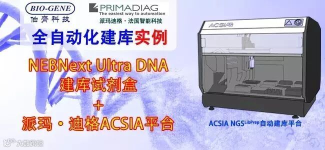 空白归功于ACSIA平台的灵活性,派玛.迪格公司的科研人员将NEBNext Ultra DNA kit的文库构建操作步骤在ACSIA NGSLibPrep自动建库平台上实现了全自动化。派玛.迪格公司将提供优化好的预设程序,中途不需要人工干预,一次实现96个文库的全自动化构建。3小时的人手建库工作,使用自动化平台,只需人手操作10分钟。