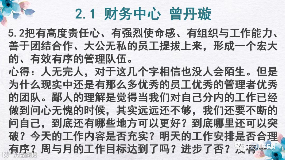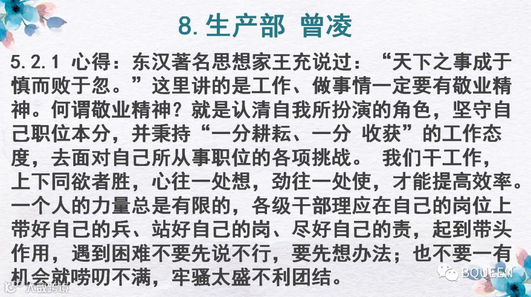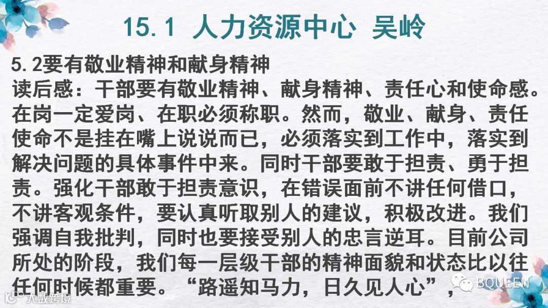 本次分享的章节是:《5.2要有敬业精神和献身精神》,主要内容是:考核干部,要看奋斗意志,要看干劲,不能光看技能。干部要有敬业精神、献身精神、责任感和使命感。