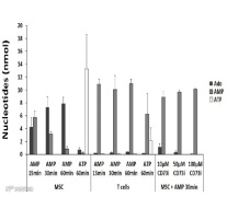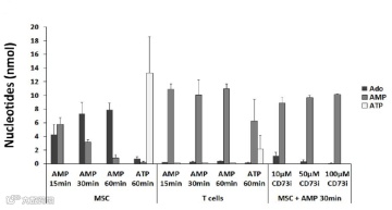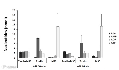图4.腺苷的产生需要活化的T细胞和MSCs之间的协同合作。活化的T细胞高表达CD39可以有效地切割ATP产生AMP,MSCs本身无法有效地切割ATP产生Ado。 |