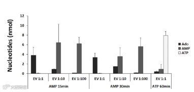 图3.MSC-EVs切割AMP产生Ado。MSC-EVs由于携带高表达的CD73,可以有效地切割AMP产生Ado。 |