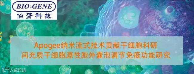 日前,芬兰科学家Kerkela E等人的研究工作,清楚地揭示了MSCs及MSC-EVs通过胞外核苷酸外切酶CD39-CD73-腺苷代谢通路调节免疫反应的机制,对于最大限度开发MSCs和MSC-EVs的临床应用潜力具有重要的意义。在研究过程中,研究人员针对不同的研究目的,恰到好处的运用了流式细胞仪对相关问题进行分析,为清晰的揭示MSCs和MSC-EVs通过CD39-CD73-腺苷代谢通路抑制免疫反应提供了非常有利的条件。考虑到常规流式细胞仪未能有效检测和分析纳米级MSC-EVs,研究人员特别应用了Apogee超灵敏纳米流式细胞仪A50-Micro,针对性地对细小的MSC-EVs进行了分析 (图1),为揭示携带CD73的MSC-EVs通过与高表达CD39的T细胞之间的协作来调节免疫反应提供了良好的研究思路。