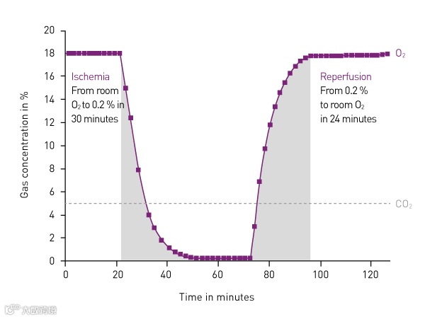 缺氧和缺血再灌注往往与致命性疾病相关联,例如中风、心肌梗塞、休克、动脉粥样硬化和癌症等疾病都能引起供血受阻从而导致氧气(O2)和营养供应的减少。在体外对这些改变的研究,需要一种快速自动控制气体环境的功能,以实现自动建立病理环境(缺氧以及自动恢复/再灌注),并同时对其它生物指标进行实时检测。