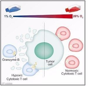 魏茨曼科学研究所的研究发现:缺氧培养后的T细胞在对抗癌症方面更有效。与用普通T细胞治疗的老鼠相比,缺氧T细胞治疗的小鼠活得更久,它们的肿瘤缩小也更明显。然而缺氧T细胞并非比普通T细胞能更好地渗透肿瘤,它们能更有效对抗癌症是因为含有更高水平的破坏性酶——颗粒酶B(granzyme B),后者可以穿透并杀死癌细胞。