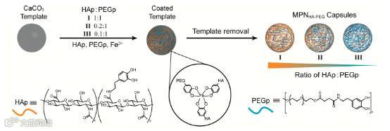 首先向CaCO3颗粒混悬液中同时添加三种不同比例的HA-多酚(HAp-橙色)和PEG-多酚(PEGp-蓝色),紧接着加入Fe3+,然后提高pH将HAp,PEGp和Fe3+包被在CaCO3模板上,最后溶解掉CaCO3模板得到不同HAp:PEGp比列的MPNHA-PEG胶囊。
