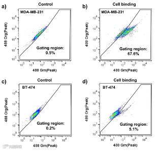 a)和c)分别是未施加MPNHA-PEG胶囊处理的MDA-MB-231和BT-474细胞,和相应的圈门处理;