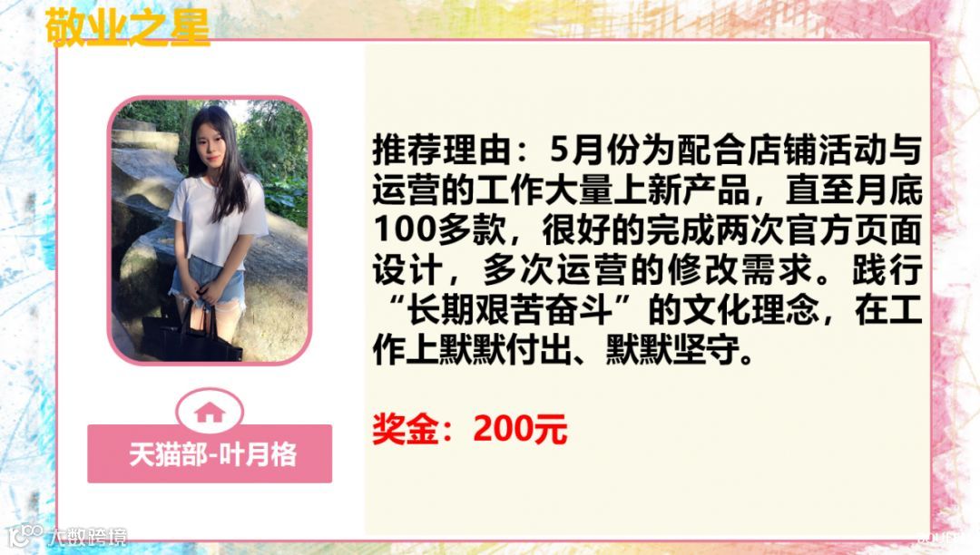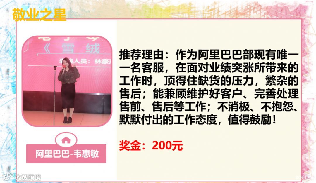 获得2019年敬业之星的小伙伴有:天猫部-叶月格;阿里巴巴-韦惠敏;
