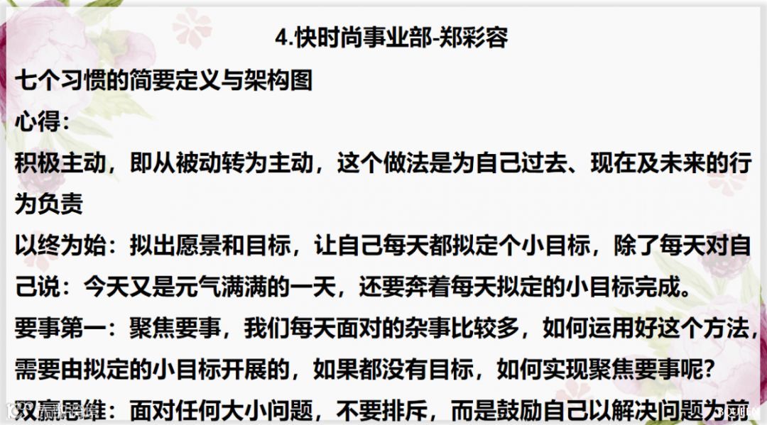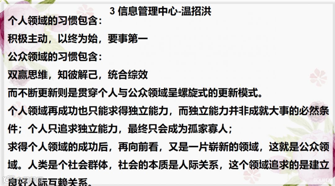 本期读书分享会主要分享的内容为:七个习惯的简要定义与架构图;针对此章节我们做了小型的主题讨论会,加深了我们对此章节的理解。
