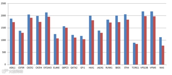二代测序检测中,ACSIA(蓝色)和人手(红色)预备样本中的18个基因组检测覆盖深度 |