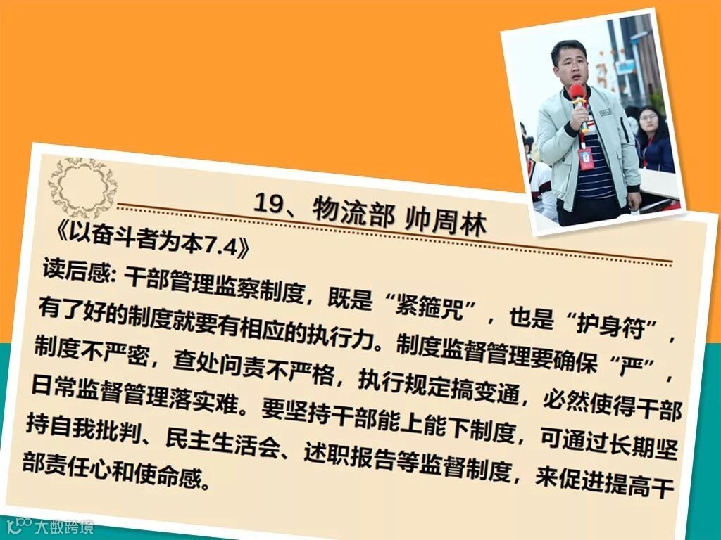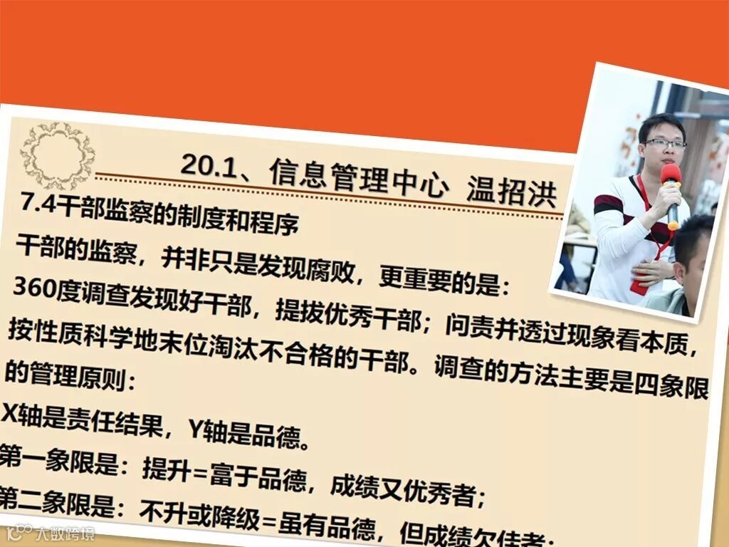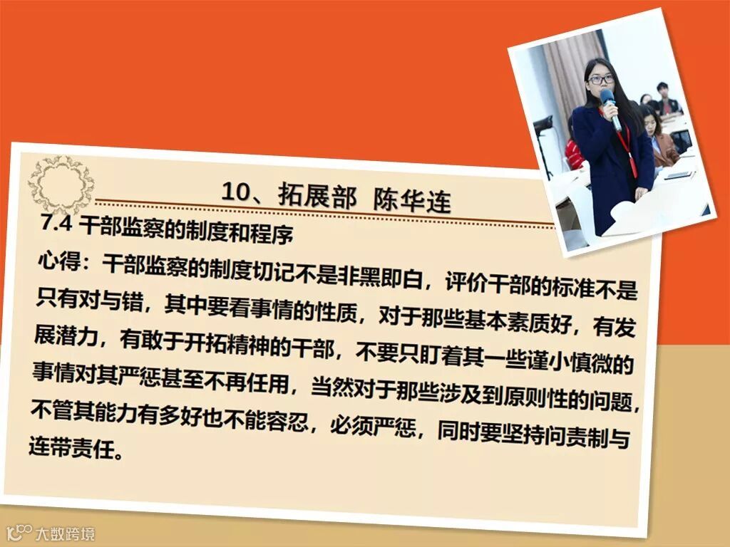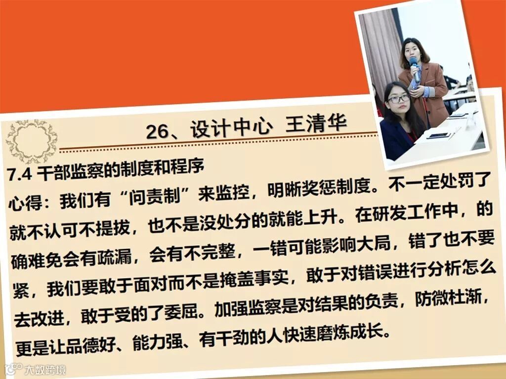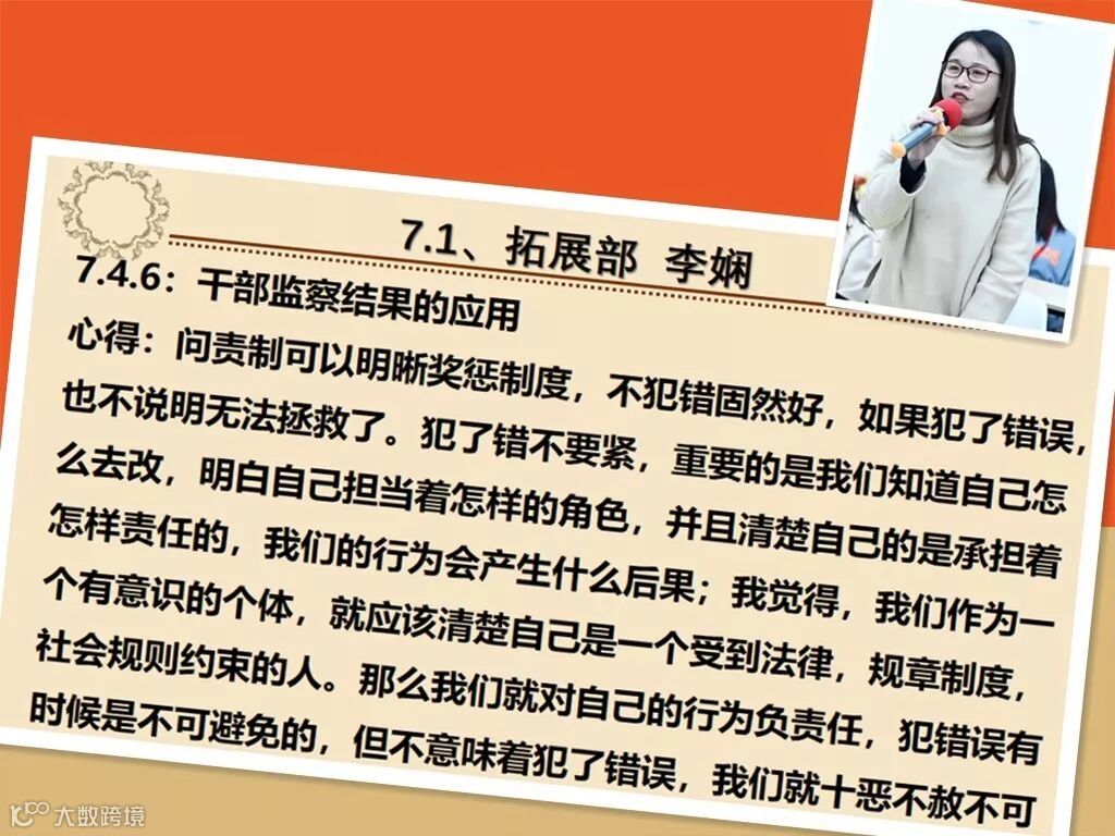 2018年12月20日,公司在会议室组织了第43期读书分享会,本次分享的章节是7.4《干部监察的制度和程序》,在本次分享会上,许多小伙伴的分享都有异曲同工之处,比如说:错误的性质甄别,问责制的实行;话不多说,一起来看一下吧~