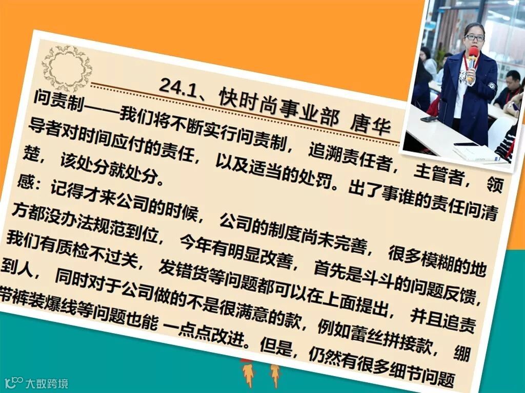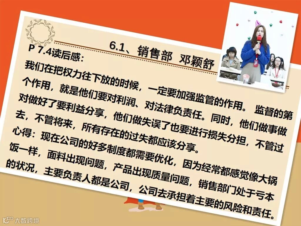 在听了这么多小伙伴的分享之后,我们的刘大大,刘总也提出了一些见解,现在的很多时候,我们只是再讲“奖”而不是“罚”,当然,罚不是目的,但却能保证我们对工作有责任和敬畏感!所以应该要健全我们的制度。