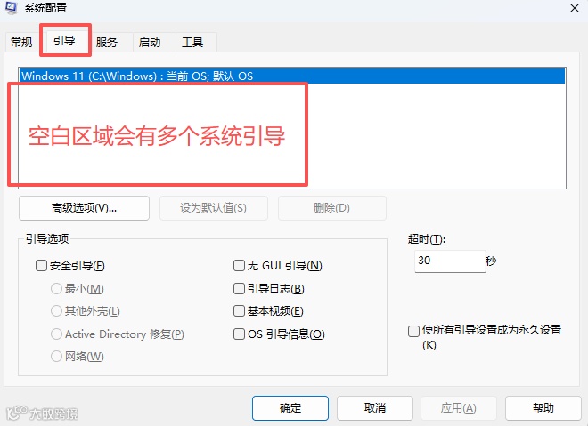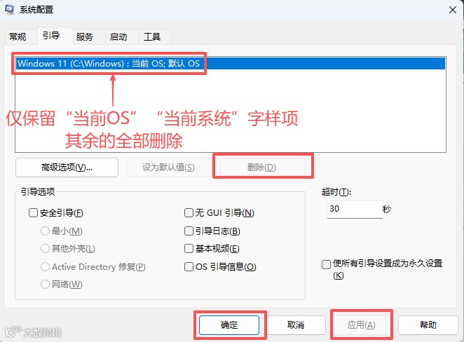 这里的”当前OS”或”当前操作系统“字样的引导选项不要动,不要删。把其它的选项全部删掉,选中后点删除-应用-重启。参考以下示例图: