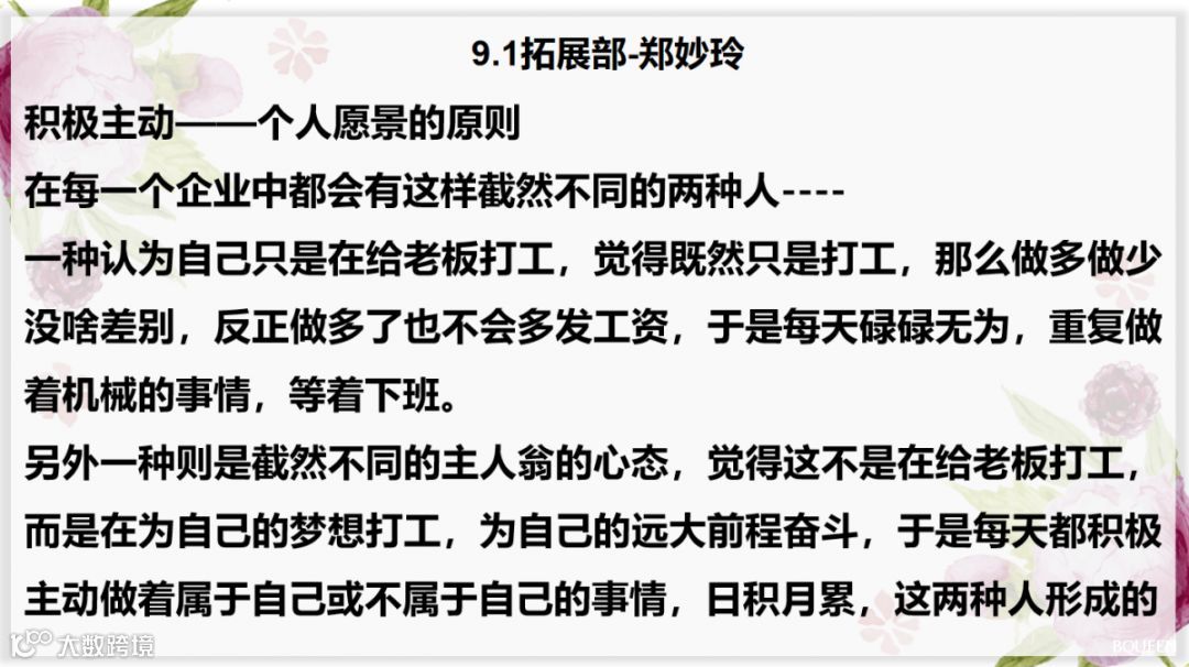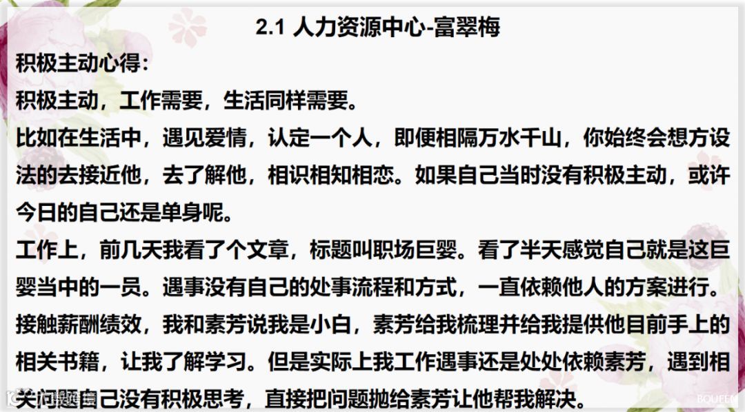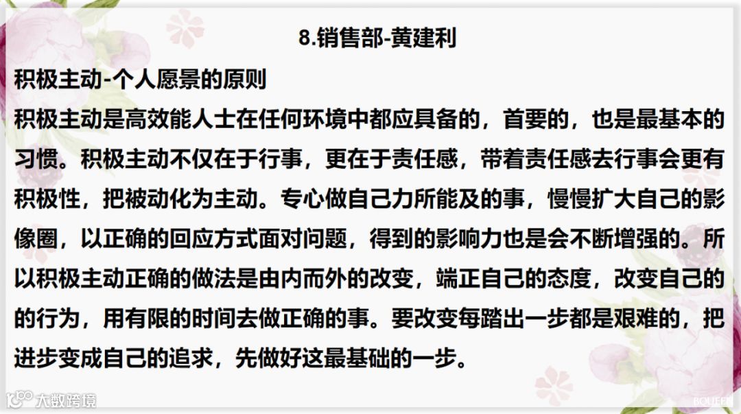 每个人理解的积极主动内涵都是不一样的,但是都有一个共同点,从小事做起,从心得分享开始!