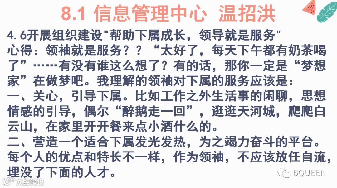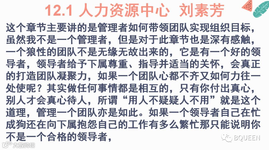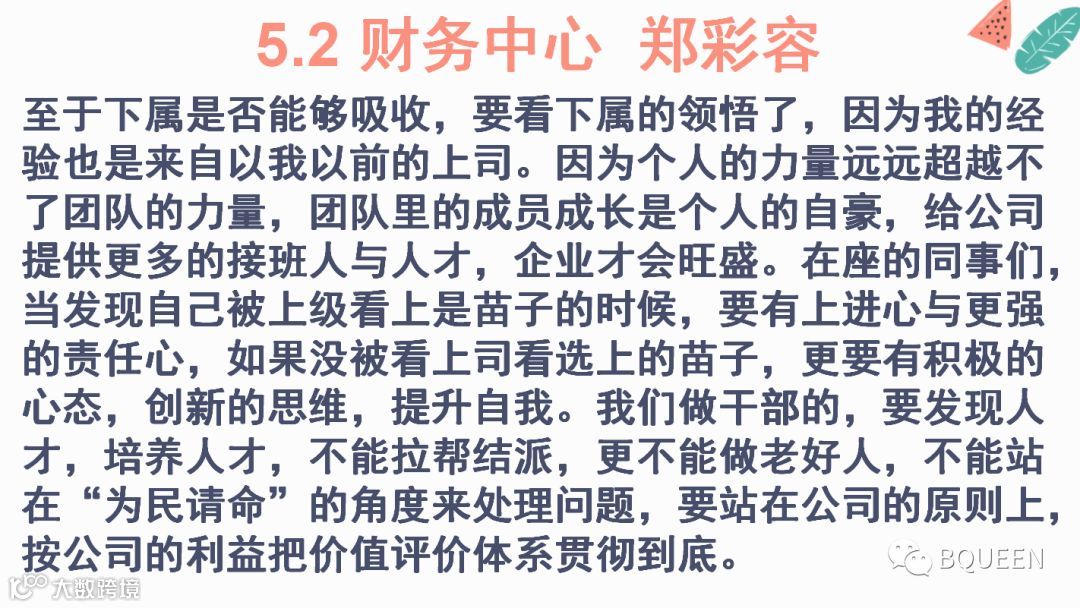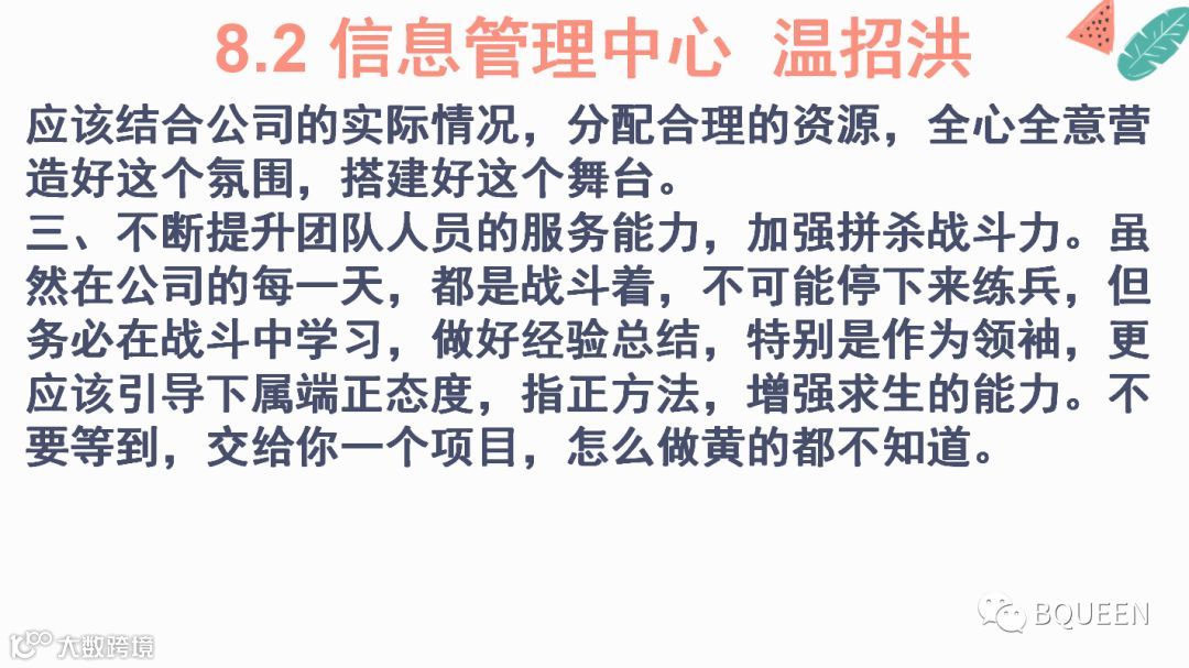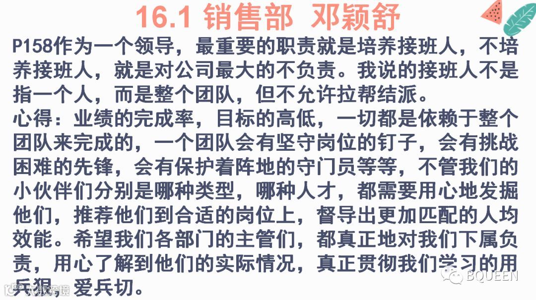 感谢颖舒的总结,颖舒说的很对,作为一个领导者,要对下属恩威并施,不是一味的严格也不是一味的包庇,奖惩分明,才能利于下属的成长,希望各位大佬可以积极培养出优秀的人才为碧婷的成长添砖加瓦。