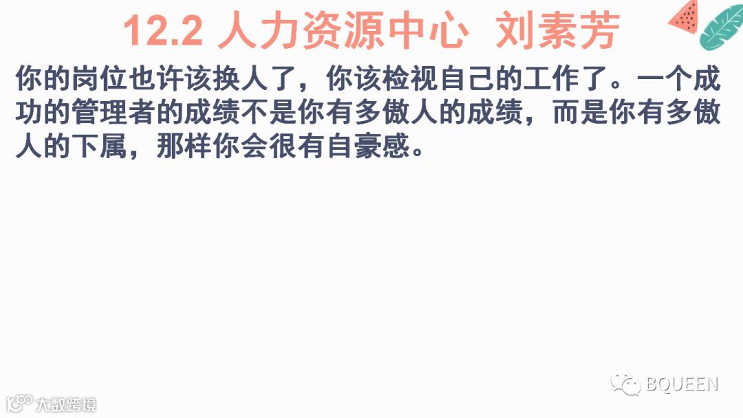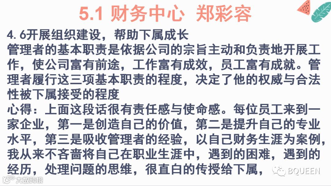 本次分享的内容是《4.6开展组织建设,帮助下属成长》,主要内容是:一个领导的重要责任是无论何时、何地都要发现人才、推荐和培养人才、考核及督导人才,并对推荐人才的品德承担连带责任。