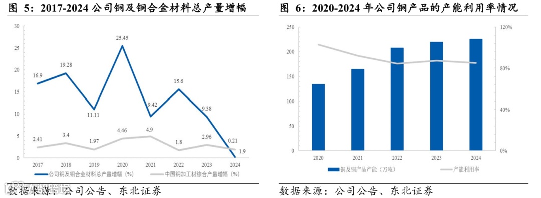 铜加工产品:产量呈现增长趋势,产能利用率维持在较高水平。公司铜加工主要生产基地位于宁波市,总计占地超2000亩,还在江苏、广东、重庆及越南设有生产基地,泰国生产基地在建;随着“泰国年产8万吨精密铜管生产项目”建设进展顺利,越南新能源汽车用电磁扁线项目、越南紫铜管件项目持续扩大业务合作,公司产能进一步增加。截至2024年末,公司铜及铜产品年产能超220万吨。2017-2023年,公司铜及铜合金材料总产量增幅高于中国铜加工材综合产量增幅;产能利用率方面,2022-2024年公司铜加工产品的产能利用率维持在85%左右,保持在较高水平。