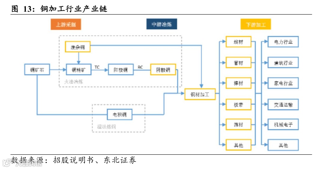 铜加工行业在铜产业链中处于中下游位置,铜加工行业的上游为铜矿开采行业及铜冶炼,其所生产的电解铜为行业企业的主要原材料,铜原料的成本在铜加工产品成本中所占比例极高,上游铜冶炼行业的生产经营直接决定了市场上电解铜的供应量,从而与市场需求和投资需求共同决定铜的市场价格。铜加工产品主要以“原材料价格+加工费”的方式结合市场竞争情况定价,原材料价格随市场波动,加工费由铜加工企业和客户根据产品规格、工艺复杂性等因素协商确定。铜加工公司的利润主要来自于相对稳定的加工费。