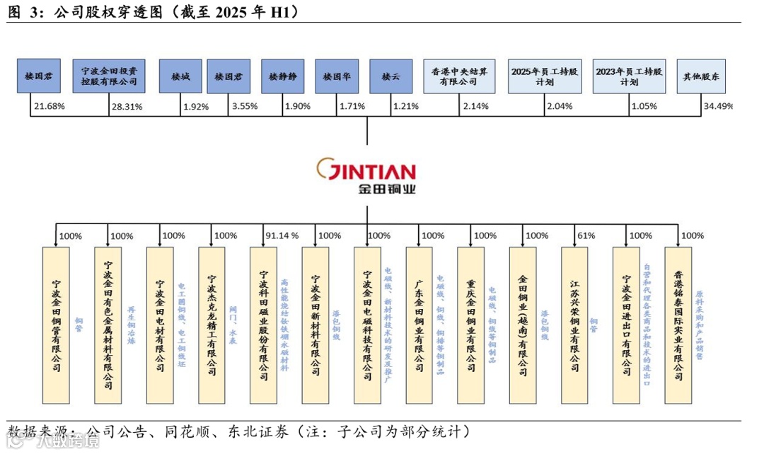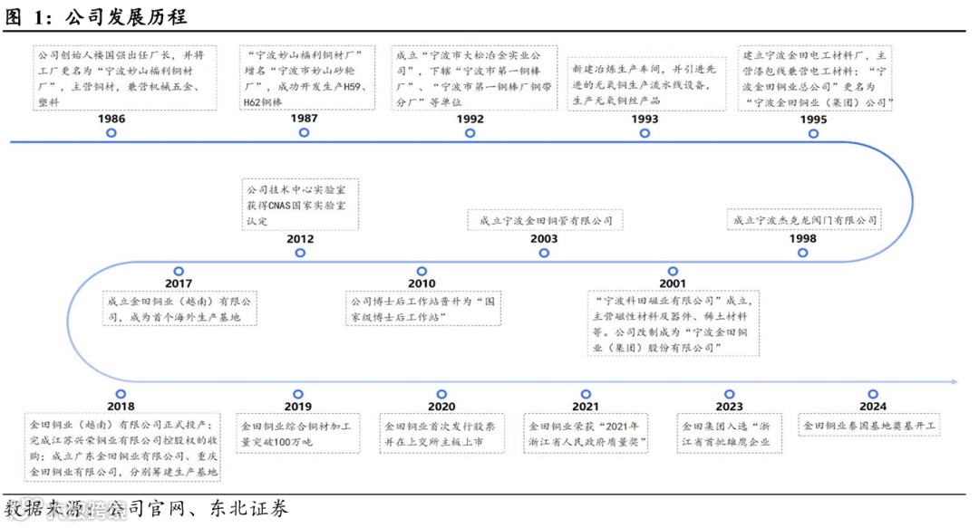 宁波金田铜业(集团)股份有限公司是国内铜加工行业龙头。公司成立于1986年,深耕有色金属加工领域39年,向下游诸多支柱型、科技类产业及先进生产力领域提供关键基础材料支持,形成了以铜及铜合金材料、稀土永磁材料为核心的多品类细分产品矩阵。目前,公司已成为国内产业链最完整、品类最多、规模最大的铜及铜合金材料生产企业之一,也是国内稀土磁材行业中技术较高、产品体系完善的企业之一。同时,公司立足宁波,放眼世界,在全球有八大生产基地,46家分子公司,8000余名员工。在美国、德国、泰国、日本、韩国等地设立分支机构,业务遍及100多个国家和地区,是众多世界知名企业的长期合作伙伴。2020年,公司首次发行股票并在上交所主板上市。