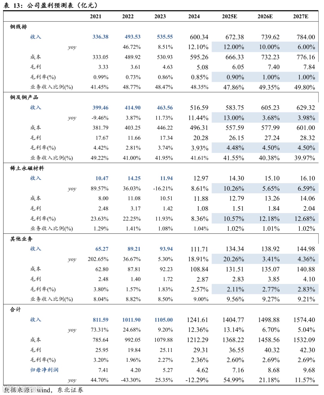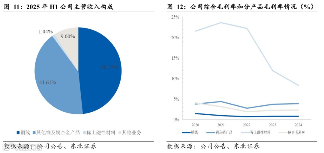 公司主营业务稳定,铜加工产品贡献核心收入。公司的主要收入来源于铜线(排)和铜及铜合金产品两大类型铜加工产品。2024年,铜线(排)实现营收600.34亿元(同比+12.10%),其他铜及铜合金产品实现营收516.59亿元(同比+11.44%),合计营收占比约为90%;稀土永磁材料业务保持稳定,营收占比约为1%;公司其他业务收入占比约为9%。