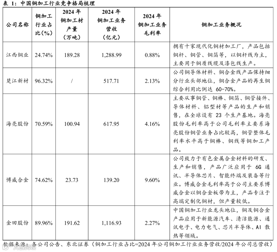 中国铜加工行业呈现“头部集中、长尾分散”的竞争格局。江西铜业、宁波金田铜业、浙江海亮股份、安徽楚江新材等龙头企业凭借规模优势与技术积累,在高端铜材市场占据主导地位。未来,铜加工行业集中度预计将进一步提高,大量生产成本较高、经营不规范、先进加工能力不足的小散企业将逐步退出市场,龙头企业的价值日益凸显,有利于增强龙头企业的议价能力和盈利水平。公司作为国内铜加工行业龙头,市占率有望持续提升。
