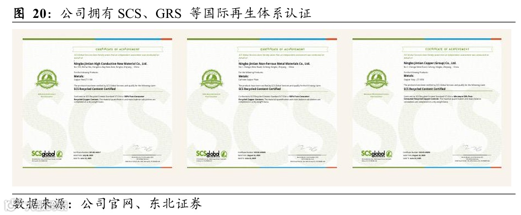 再生铜:再生铜是铜生产消费的重要组成部分,再生铜回收利用可以在相当程度上解决铜矿原料不足的问题。同时,以废杂铜为原料生产阴极铜具有能源消耗低、环境污染小的特点,是发展循环经济的重要环节。公司不断创新铜基高新材料绿色发展新路径,已成为国内再生铜利用量最大、综合利用率最高的企业之一,也是全球业内为数不多的实现再生铜回收、提纯、深加工全产业链闭环的公司。同时,公司注重新产品绿色认证及大客户审核,目前已经通过SCS翠鸟再生成分认证、GRS全球回收标准认证、LCA碳足迹认证、RBA责任商业联盟认证等。