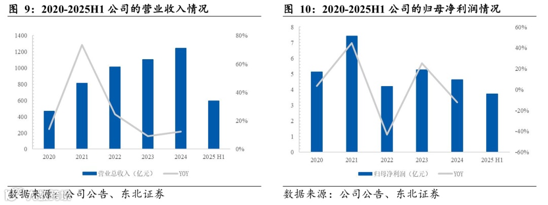 公司营收保持较快增长,综合毛利率自2022年呈现修复趋势。营收:2020-2024年,公司营收从468.29亿元增长至1241.61亿元,年复合增长率为27.60%;2025年H1,公司实现营收592.94亿元(同比+2.46%);净利润:2020-2024年,公司净利润整体短期承压;2025H1,公司实现归母净利润3.73亿元(同比+203.86%),盈利能力提升显著,主要系公司高毛利产品占比稳步提升,同时深化国际化布局。毛利率:2020-2022年,公司毛利率呈现下行趋势,主要系受铜加工费下行影响,贡献核心毛利润的铜合金产品和铜线排毛利率分别同比下降;2023-2025H1,随着2022年铜加工产品毛利润触底反弹,2023-2024年的铜加工产品毛利率逐步得到修复,驱动公司综合毛利率逐年回升。