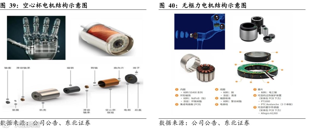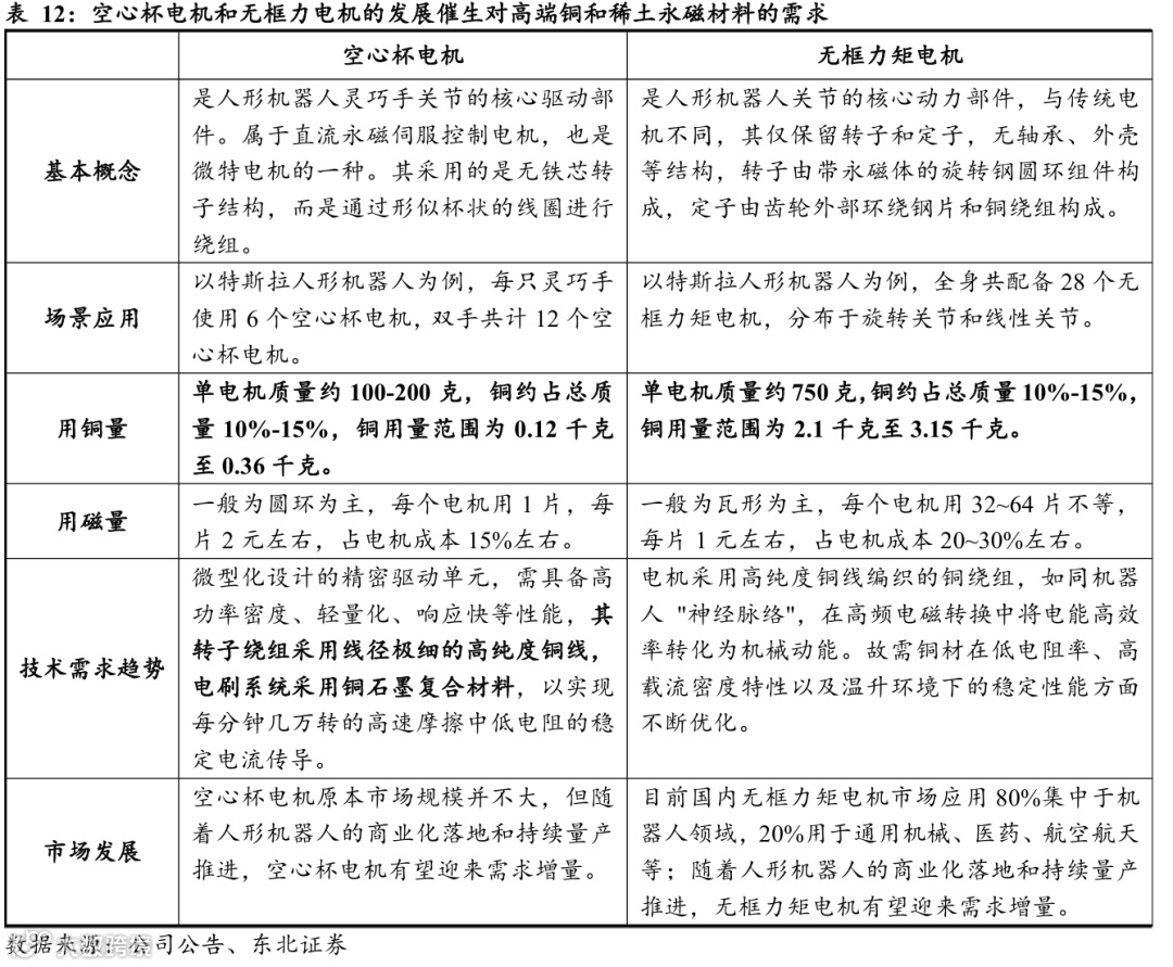 空心杯电机和无框力电机作为人形机器人动力的核心零部件,未来铜材料和稀土永磁材料应用广阔。空心杯电机凭借节能性、控制灵敏性和运行稳定性,成为机器人灵巧手的核心部件。其独特设计使得转矩分布更均匀,在低速运行中保持平稳,高速运转下减少震动与噪音,尤其适用于需要高精度动作的场景,例如穿针引线或弹钢琴等高难度操作。线圈绕组工艺复杂度高,需兼顾轻量化与效率,制造过程中对材料精度和工艺稳定性要求苛刻;无框力矩电机因体积小、功率密度高、低转速大扭矩等特性,成为人形机器人关节驱动的首选方案。其直接集成于机械结构的特性,可显著降低系统复杂性,满足轻量化与高效率需求。当前,线性传动与旋转传动的技术融合进一步提升了其在机器人运动控制中的适配性,技术挑战集中于磁路设计与工艺优化。随着人形机器人的量产和产品不断优化,铜材料和稀土永磁材料作为空心杯电机和无框力电机的上游原材料,也有望迎来显著需求增量。