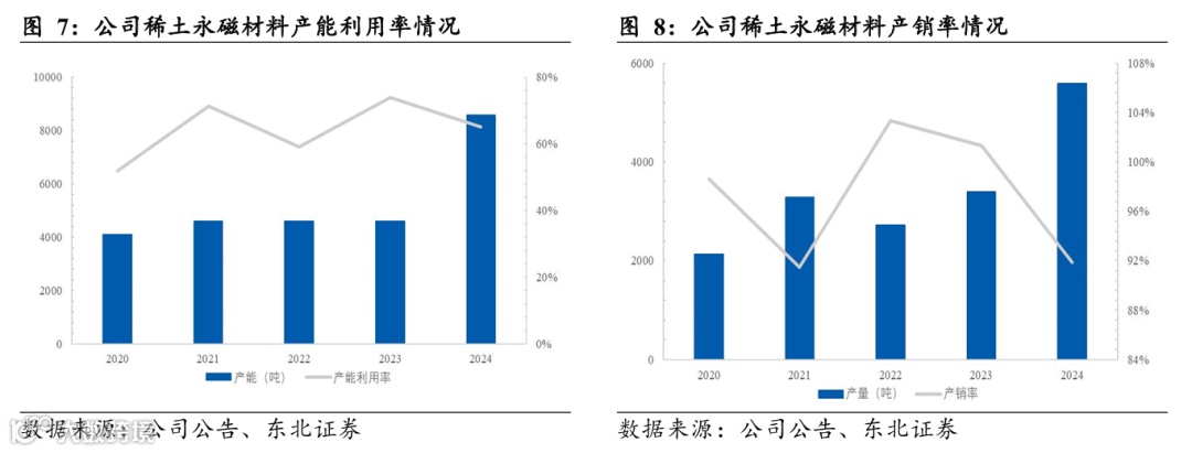 稀土永磁材料:公司设有宁波和包头两处磁性材料生产基地,包头基地一期已投产,公司稀土永磁材料的年产能已提升至9,000吨。公司积极推进包头基地二期项目,以进一步将产能提升至1.3万吨。公司稀土永磁材料的产能和产量稳中有升,产销率和产能利用率保持在较高水平。