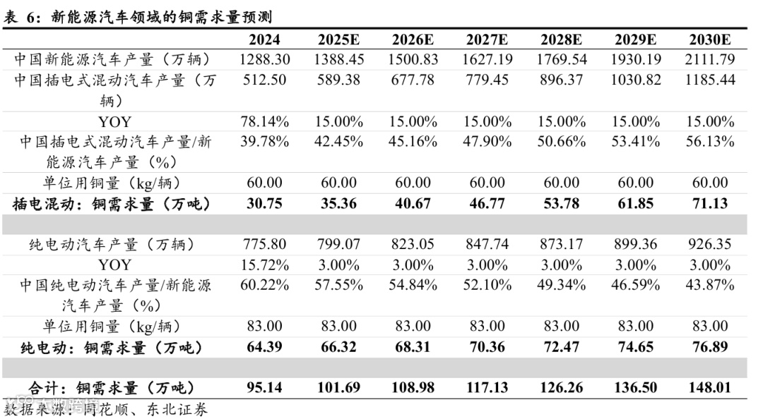 根据我们的测算,预计中国2025年应用在新能源汽车的铜需求量约为102万吨,2030年有望增长至148万吨。