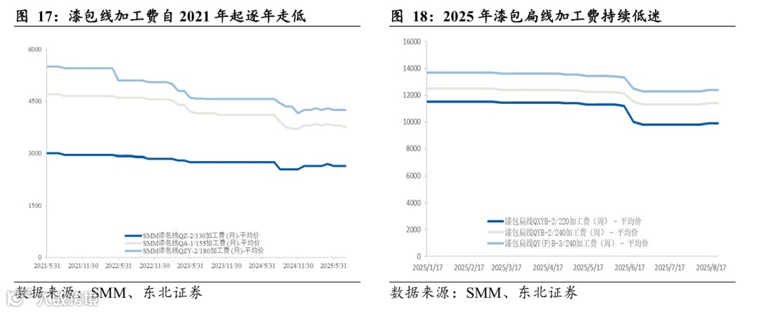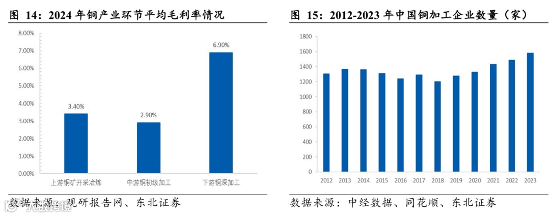 铜加工行业竞争格局:竞争加剧,企业利润承压,进入行业整合阶段。我国铜加工庞大存量产能主要得益于铜加工企业数量不断增加,2023年底国内共有1581家存量公司。铜初级加工企业定价模式多为“原材料价格 + 加工费”,近年来铜加工产能扩张速度远超过需求增长幅度,行业竞争不断加剧,导致加工费持续承压下行。当前中游企业毛利率普遍处于较低水平,部分企业甚至已陷入亏损状态。