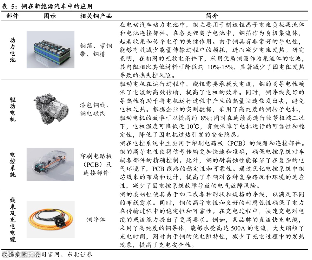 铜材具有优异的导电性和导热性,是新能源车不可或缺的重要材料。相较于钢铁和铝等传统材料,铜虽然具有成本高昂的缺点,但它具有优异的导电性、导热性、耐久性、延展性和经济性,使得铜材料成为了新能源汽车各个部件的首选材料。例如,铜的电导率为59.6 MS/m,而铝的电导率仅为37.8 MS/m。这意味着铝导线必须比铜导线粗63%,才能承载相同的电流;而使用铜导线将能够在不牺牲性能或安全性的情况下,减轻车辆的整体重量。铜材被广泛运用于新能源汽车的动力电池、驱动电机、电控系统、高低压线束、充电线缆和充电基础设施等部件中,其使用量约占新能源汽车总重量的4-5%。未来随着技术的进步和市场的变化,铜材将朝着轻量化、高性能和环保方向发展。