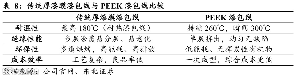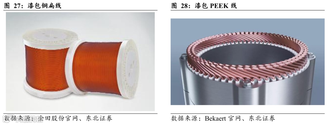 中高压的电压架构对电压的技术路线和材料提出更高的要求,漆包铜扁线成为核心工艺。高电压对电机绕组的绝缘性提出了更高的耐压挑战,处置不当便会在绝缘局部区域达到击穿场强,尤其是带电体的尖端附近,形成局部放电,强烈的局部放电会破坏绕组铜线的绝缘性能,造成短路,引发电机失效。为了满足800V的技术要求,目前主要有厚漆膜和薄漆膜+PEEK膜包两种工艺。其中,漆包线由导电芯组成,芯材多为铜,并涂有一层绝缘材料层。这种绝缘层通常是基于聚合物的漆,可保护电线免受外部因素的影响,并使电气系统能够高效地传输能量。凭借其卓越的导热性、电气性能、耐用性和经济性,漆包线被广泛运用于新能源汽车电动机中。