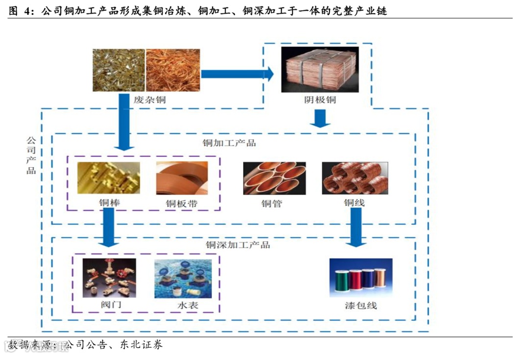 公司目前已经形成集再生铜冶炼、铜加工、铜深加工于一体的完整产业链。公司以废杂铜为原料,经阳极炉熔炼、自动定量浇铸生产阳极板,再进行电解精炼成阴极铜;在阴极铜和废杂铜等原料基础上进行初级加工,初级加工产品包括铜棒、铜板带、铜管、铜线(排)等;在初级铜加工产品基础上,通过深加工环节,生产电磁线、阀门、水表等产品。