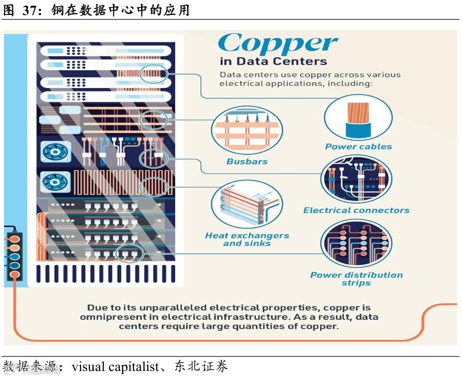 数据中心用铜集中在电力配电、接地互联和散热冷却三大场景。电力配电系统方面,铜用量占比达75%,其中,变压器、母线槽与配电柜、断路器与开关设备是铜的主要应用领域;电缆与连接系统中,铜用量占比约22%,主要用于制作铜芯电缆和高速铜缆。散热与冷却系统中,需要用铜管和热交换器来提高散热效率,这部分用铜量占比约3%左右。
