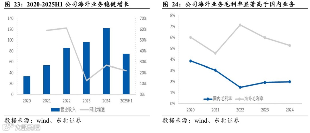 2020年-2024年,公司海外业务稳步增长,年复合增长率为38.28%。2025年H1,公司实现境外主营业务收入74.14亿元,同比增长21.86%;同时,公司海外业务毛利率显著高于国内业务毛利率,随着公司海外业务占比稳步提升,公司综合毛利率或将显著提升,或在未来成为公司业绩的主要增长点。