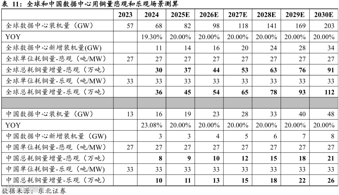 根据我们的测算,悲观场景下,全球数据中心耗铜量预计从2024年的30万吨增长至2030年的91万吨,年复合增长率约为20.60%;中国数据中心耗铜量预计从2024年的8万吨增长至2030年的21万吨,年复合增长率均为17.67%;乐观场景下,全球数据中心耗铜量预计从2024年的36万吨增长至2030年的112万吨,年复合增长率约为20.60%;中国数据中心耗铜量预计从2024年的10万吨增长至2030年的26万吨,年复合增长率均为17.67%。未来全球数据中心的增长,预计将带动铜需求的大幅增长。