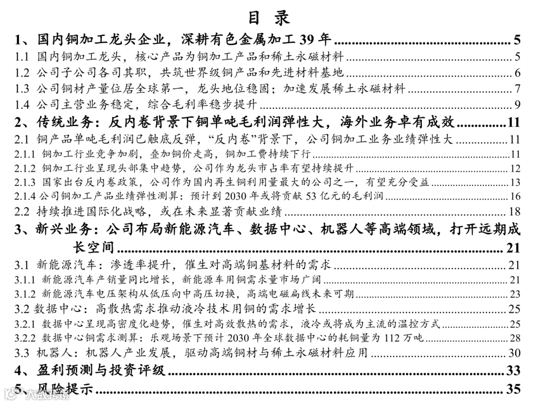 盈利预测与投资评级:考虑到公司是中国铜加工行业龙头,铜加工业务单吨毛利润触底反弹,未来业绩弹性大;同时优化产品结构,布局AI数据中心和机器人等新兴领域,深化国际化布局,驱动毛利率提升。我们预计2025-2027年公司实现归母净利润7.16/8.68/9.68亿元,对应PE为28.85X/23.80X/21.34X,予以“买入”评级。