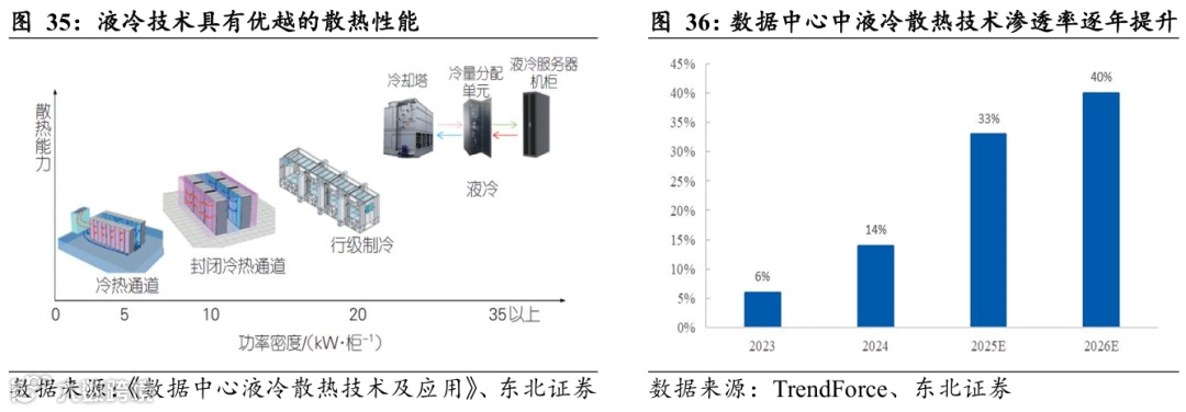 AI数据中心高能耗和高散热需求驱动液冷技术在AI数据中心的渗透率逐步提升。目前数据中心的散热方式仍然以风冷为主,在算力设备以及数据中心机房的高热密度趋势和高能效散热要求的双重推动下,预计未来液冷将成为主流的数据中心温控 方式。根据TrendForce最新液冷产业研究,随着NVIDIA GB200 NVL72机柜式服务器于2025年放量出货,云端业者加速升级AI数据中心架构,促使液冷技术从早期试点迈向规模化导入,预估其在AI数据中心的渗透率将从2024年14%,大幅提升至2025年33%,在2026年有望达到40%。