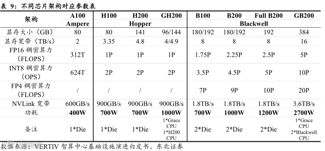 AI数据中心呈现高密度化趋势,催生对高效散热的需求。目前H100/H200/H800等芯片TDP设计功耗已达700W,2024年3月GTC大会最新发布的B200达1000W,GB200已达到2700W功耗。伴随着智算中心芯片功耗的提升,其自身的散热功耗也在不断攀升,智算中心中单机柜的热密度大幅度的快速提升,因此,智算中心将面临单机柜功耗高密化的挑战。通常数据中心由8卡GPU或NPU模组构成,基于芯片的功耗数值,可以确定每台数据中心的功耗在5kW~10kW。进一步由服务器组成整体机柜时,机柜的功率密度将达到40kW以上。以英伟达(NVIDIA)为例,DGX架构8卡GPUH100服务器额定功耗为10.2kW,安装4台服务器的风冷机柜功耗为42kW。新一代的GB200架构中,NVL36机柜功率密度为72kW,NVL72液冷机柜功率密度则为120kW。因此,单机柜功耗从传统数据中心的4-6KW逐渐增加至20-40KW,未来有望逐步发展至40-120KW甚至更高,AI数据中心呈现高密度化趋势。