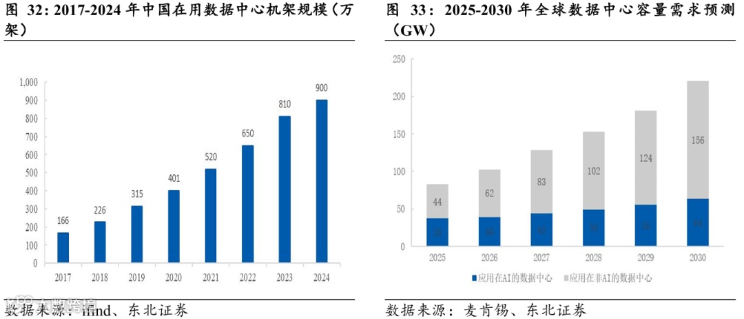 目前,全球数据中心市场迎来新一轮跃升,数字服务、云计算、人工智能和5G技术的普及持续推高对数据中心的需求,数据中心数量正在持续增长。中国互联网信息办公室统计数据显示,2017-2024年中国在用数据中心机架规模从166万架上升至900万架,年复合增长率达29.77%;全球市场方面,根据McKinsey的统计和预测,从2023年到2030年,全球对数据中心容量需求年增长率可达19%-22%的速度增长,达到每年171-219吉瓦(GW)需求。同时,AI算力驱动数据中心市场扩张,据TheNetworkInstallers的报告显示,2025年全球约33%的数据中心容量专用于AI应用,预计到2030年这一数字将达到70%。