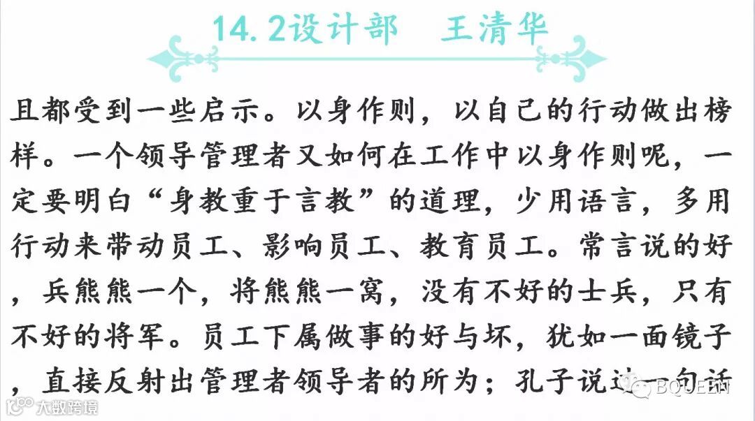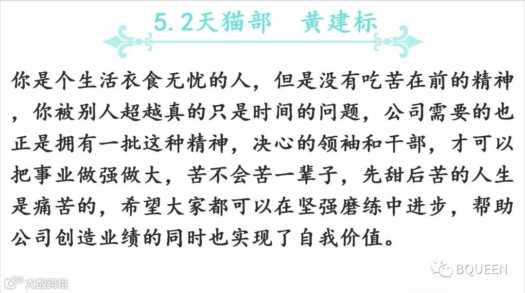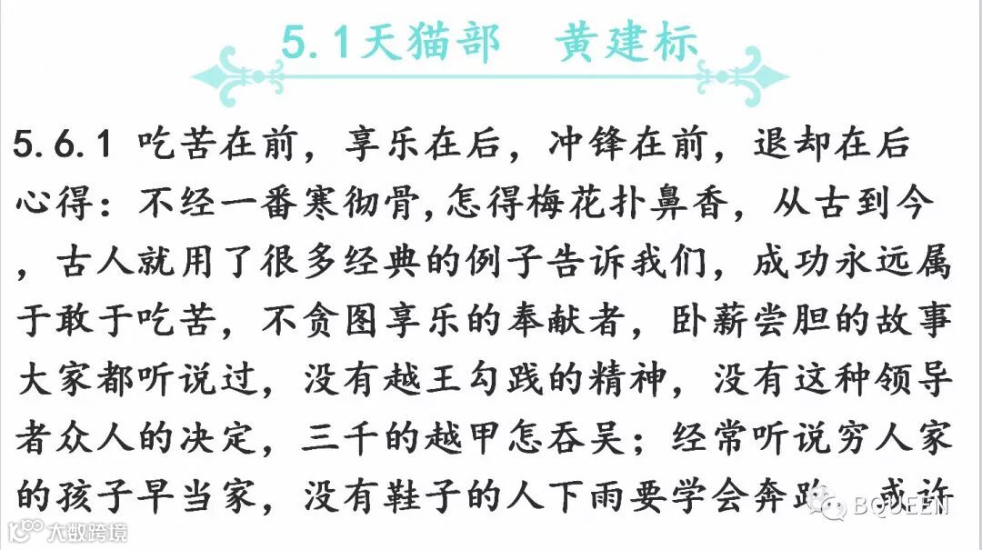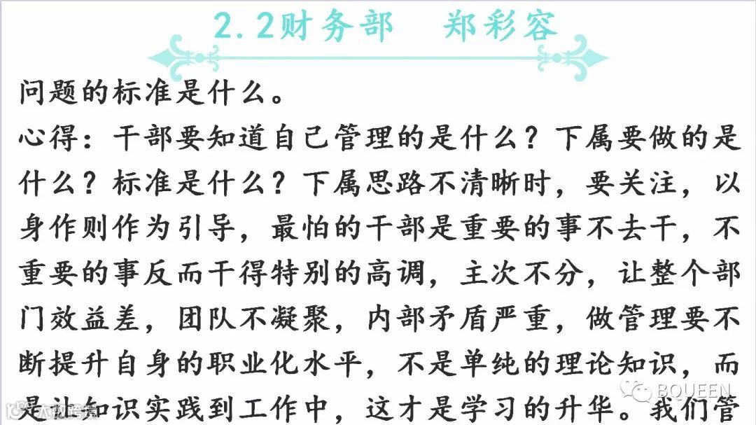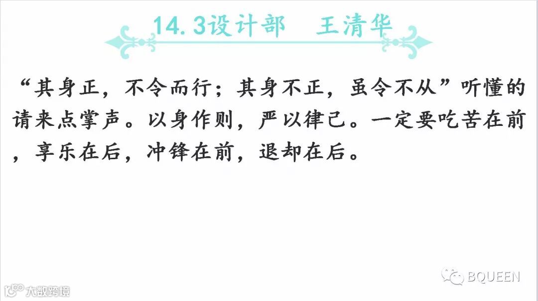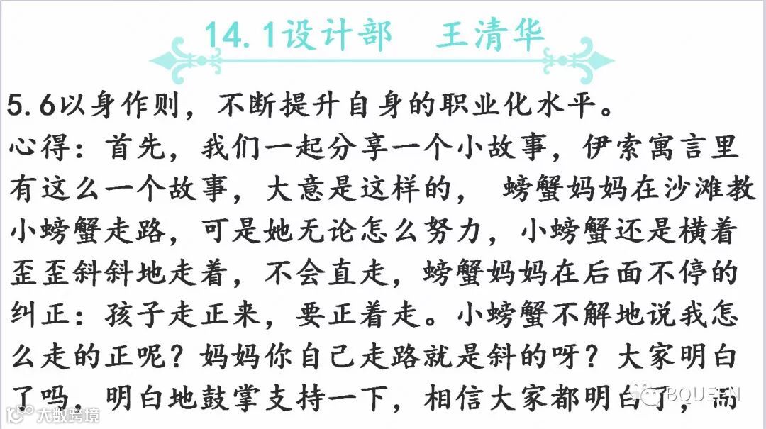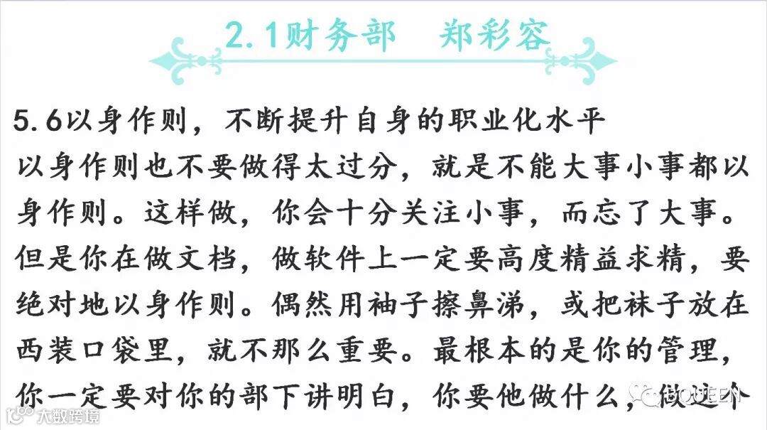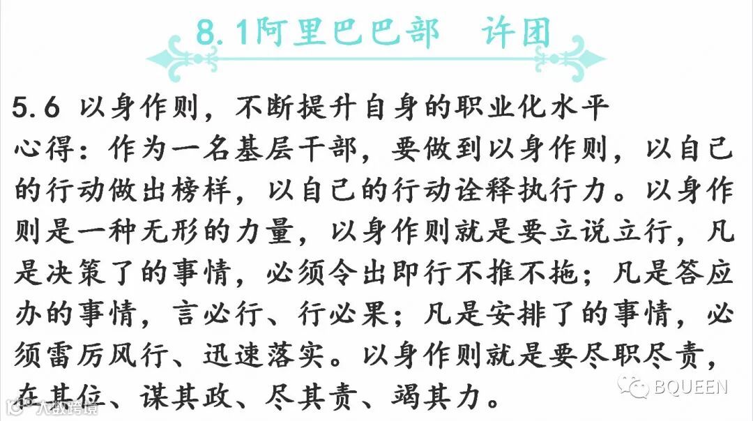 本次分享的章节是《5.6以身作则,不断提升自身的职业化水平》,主要内容是:对基层干部我们的要求是呕心沥血,身体力行,事必躬亲,坚决执行,严格管理,有效监控,诚信服从。干部一定要吃苦在前,享乐在后,冲锋在前,退却在后。一定要以身作则,严格要求自己。