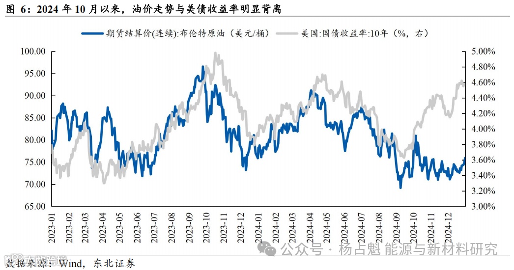(2)美国国债收益率与油价背驰:2024年10月中下旬,美国国债收益率与油价走势出现明显背驰,事实上,10月初油价上涨是由于地缘问题(以色列与伊朗、黎巴嫩的地缘冲突)所致,若排除地缘干扰,油价走势或从10月初就与美国债收益率背驰。近期油价走强,与美国国债收益率走势趋于拟合。