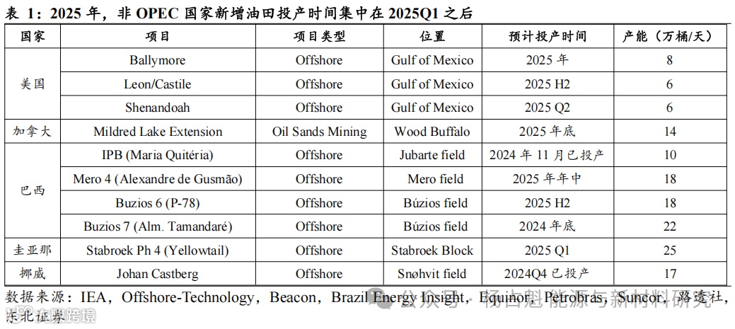 (1)非OPEC+国家:据IEA,2025年新投产油田主要来自于巴西、圭亚那、挪威、加拿大及美国,按照IEA梳理的新增油田投产节奏,投产时间集中在2025Q1之后,预计对2025Q1供给端冲击不大;