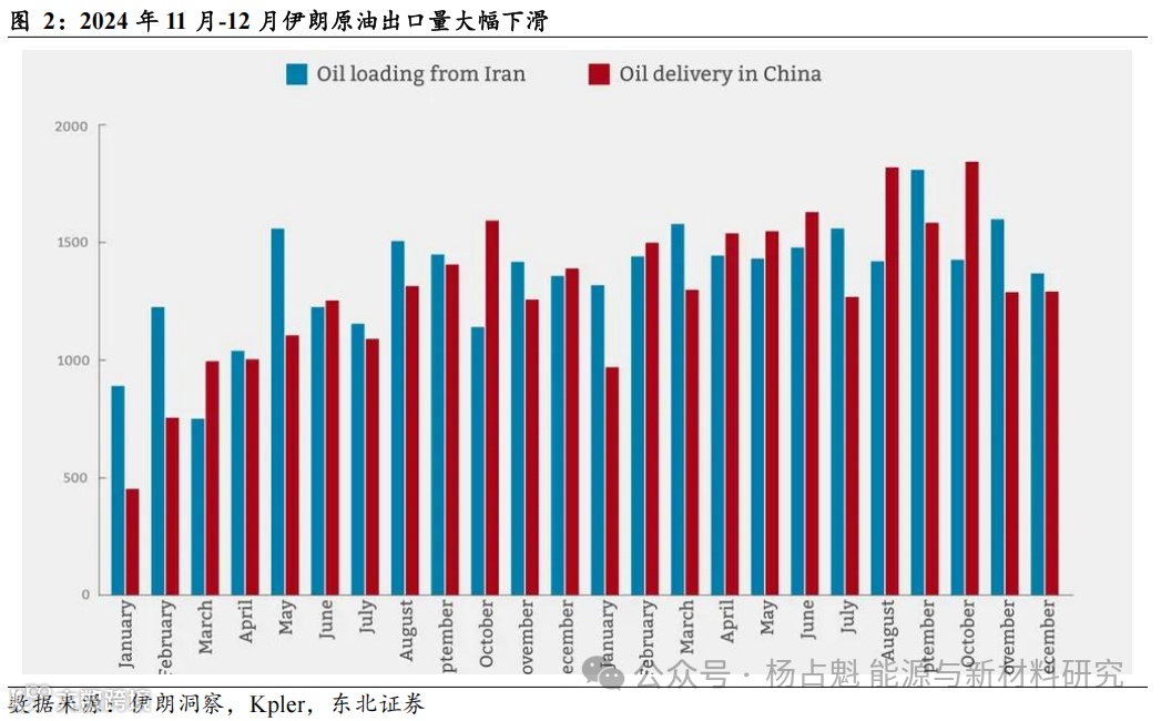 (3)伊朗:据伊朗洞察以及Kpler数据,受美国针对伊朗“影子舰队”制裁力度加大影响,伊朗石油出口大幅下降,截至2024年12月底,伊朗对中国的石油日出口量已降至130万桶以下,比10月份减少了55万桶。与此同时,伊朗未出售的浮动石油储备在此期间增加超一倍,达到约2000万桶。