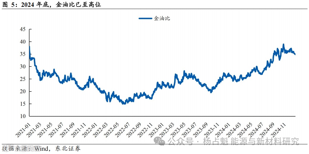 (1)金油比:自2024H2以来,金价走高,油价走弱,金油比迅速拉大,或为超额流动性先冲高了金融属性更强的黄金,近期或向商品属性更强的原油扩散。