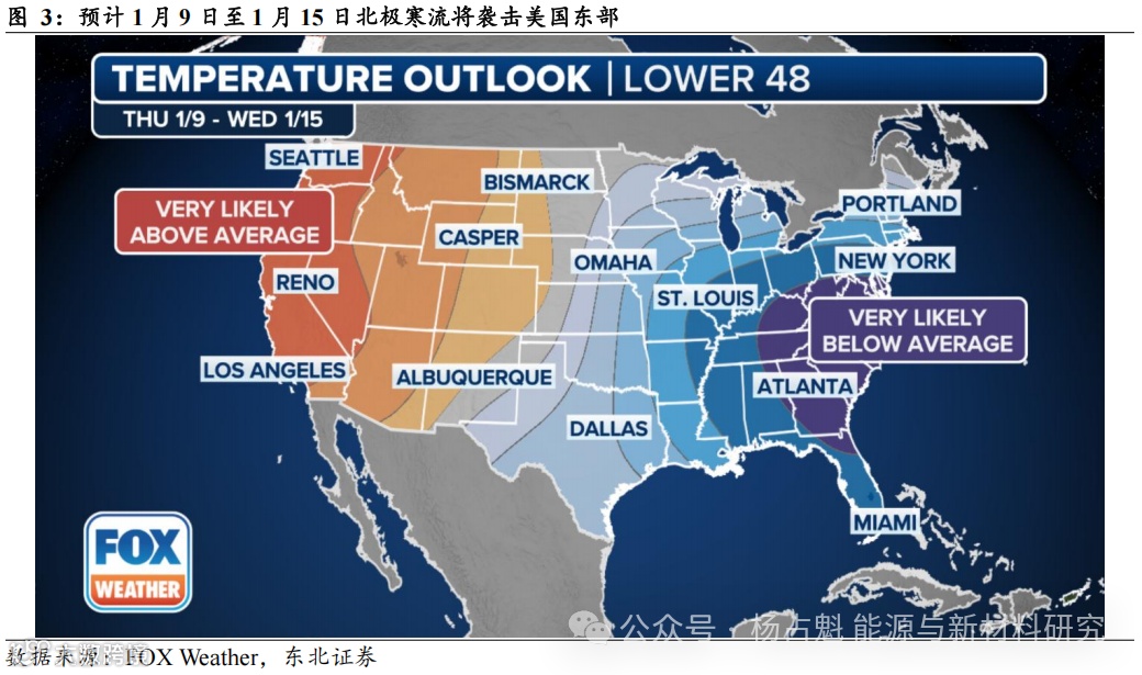 需求端:(1)据FOX Weather,2025年1月北极寒流将袭击美国东部,预计佛罗里达和德克萨斯等地的气温将大幅下降,或提振油气需求。(2)从库存角度来看,据EIA数据,截至2024年12月27日,美国原油总库存(商业库存+战略库存)已下降至80917万桶,单周减少91.2万桶,单月减少531万桶,原油库存持续回落支撑油价。