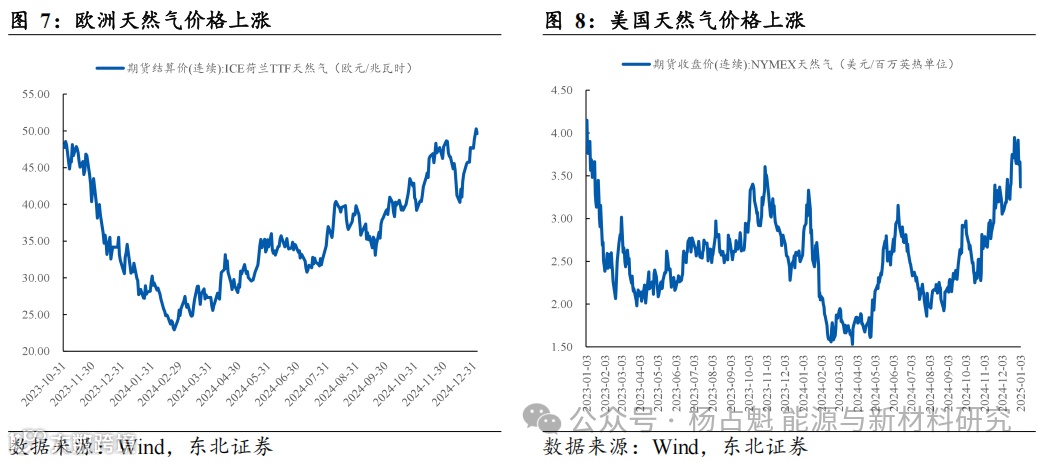 据Wind数据, 2025年1月3日ICE荷兰TTF天然气期货结算价为49.6欧元/兆瓦时,相较于12月初涨幅达2.0%;2025年1月3日NYMEX天然气期货收盘价为3.37美元/百万英热单位,相较于12月初涨幅达4.9%。气价上涨或与油价走势形成联动效应。