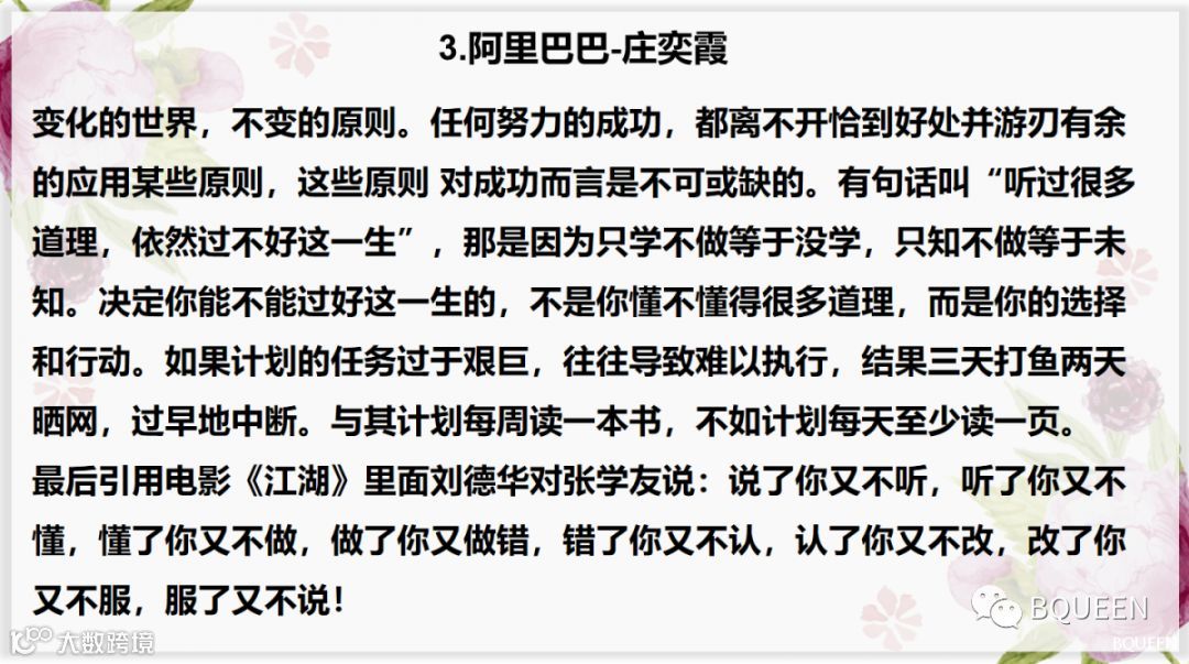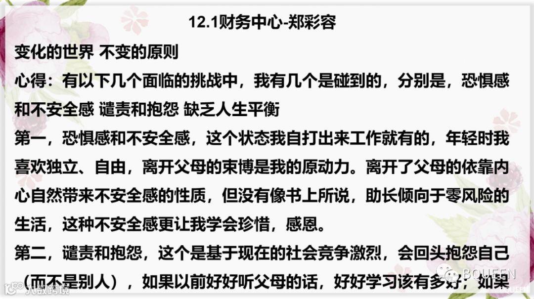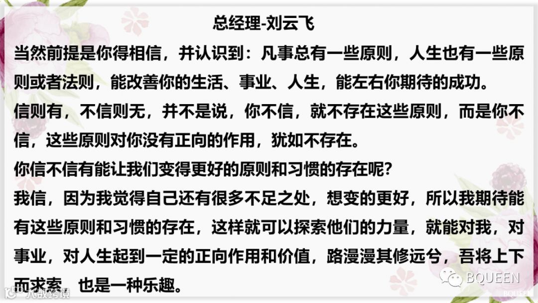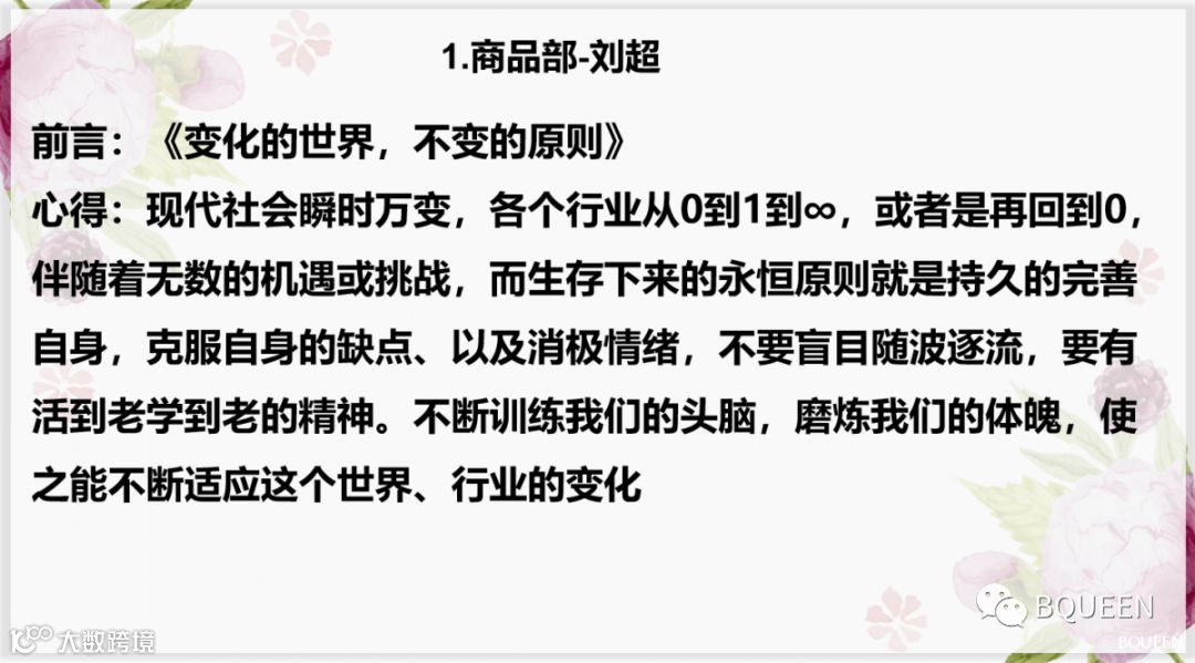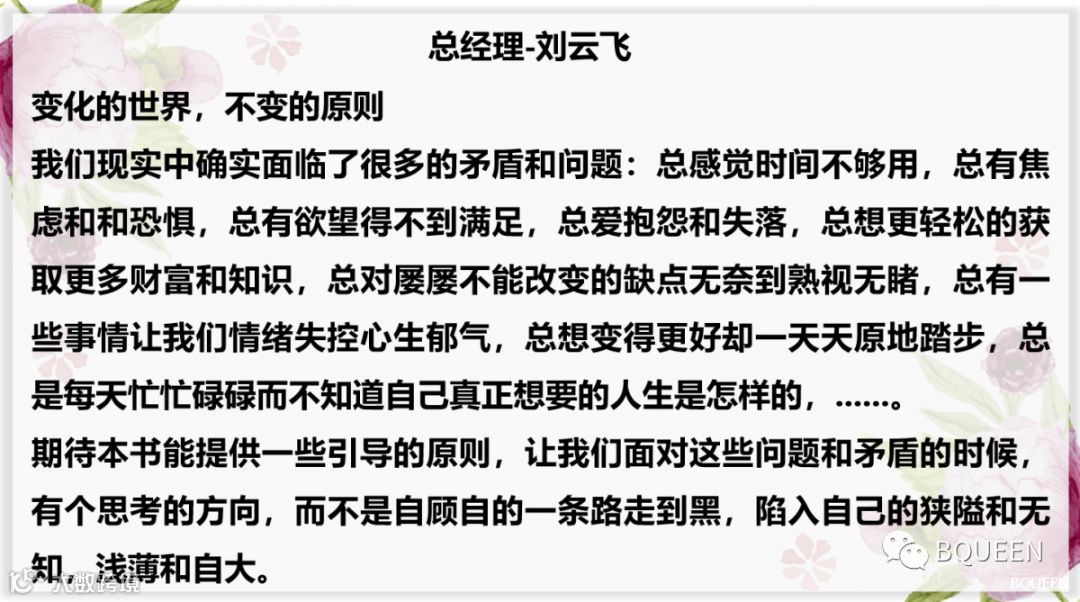 刘总在看完书本之后,也有心得心得分享给大家,但在现场,听到大家的分享,也深有感悟:做事要有原则、有套路,不断地可以去练习,做到知行合一!